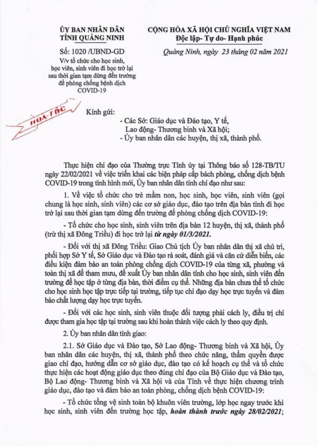 CV 910/UBND-DL1 ngày 15/2/2021 của UBND Tỉnh v.v triển khai các biện pháp cấp bách phòng, chống dịch Covid-19 khi kết thúc kỳ nghỉ Tết Nguyên đán Tân sửu.