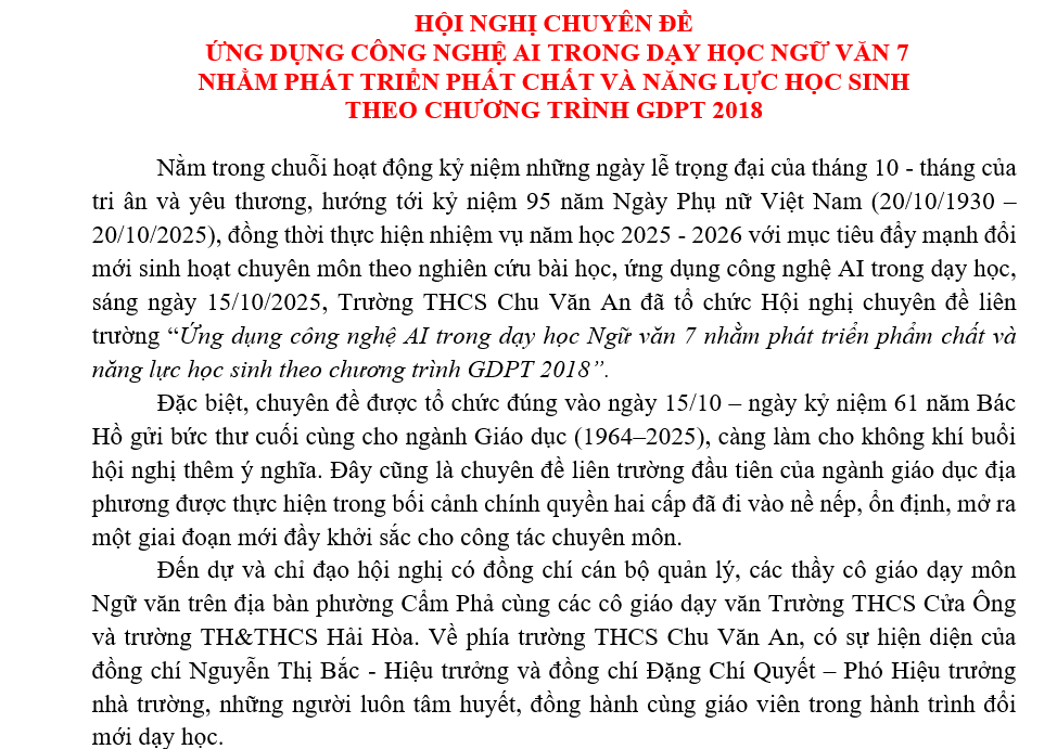 Nguồn tin: Trường THCS Chu Văn An Phường Cẩm Phả, tỉnh Quảng Ninh: